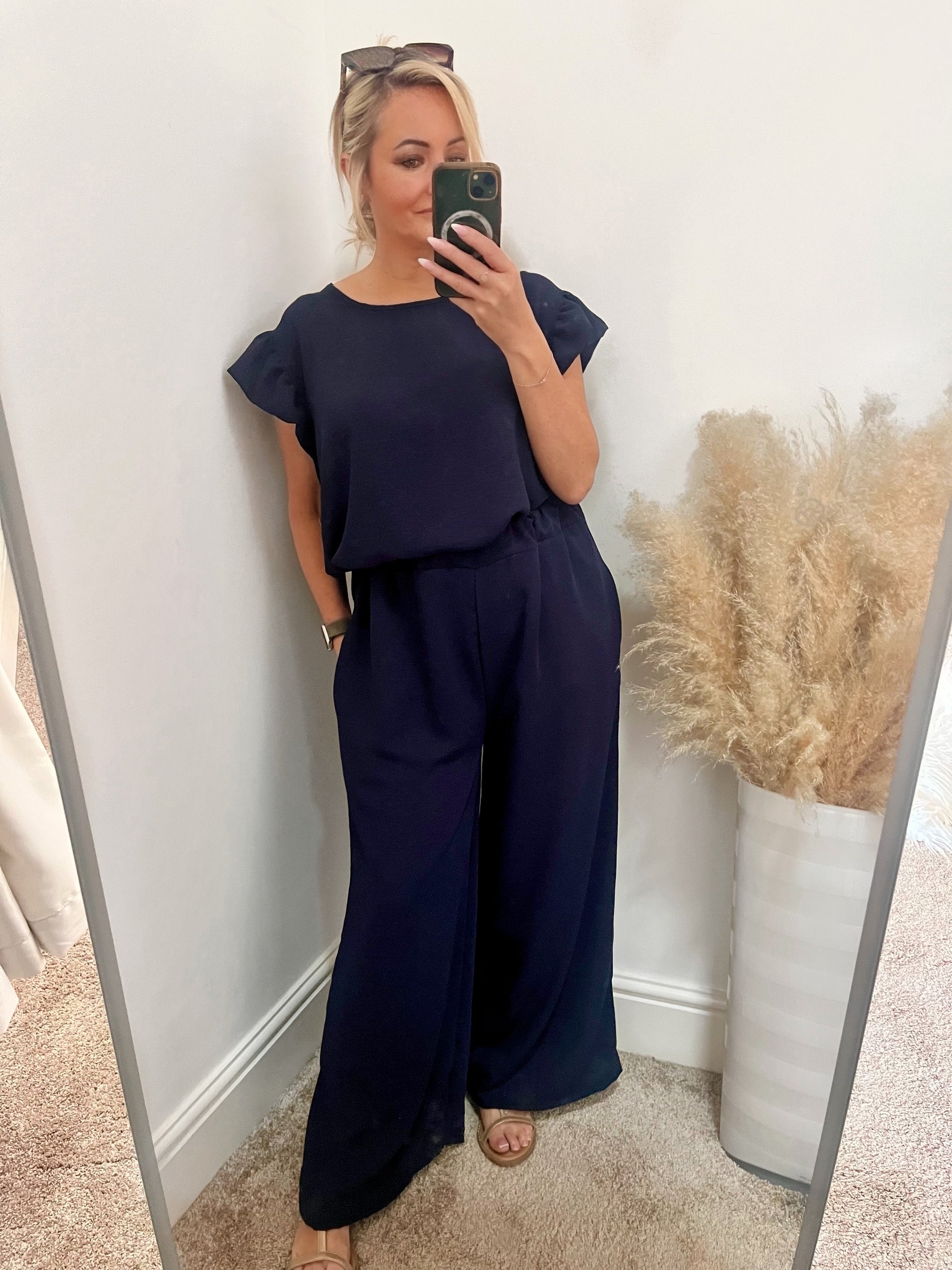 This plus-size comfy co-ord set features a relaxed ruffle-sleeve top and elasticated high-waist wide-leg trousers. Made from soft, lightweight fabric, it’s perfect for lounging or dressing up. Chic, effortless, and stylish!